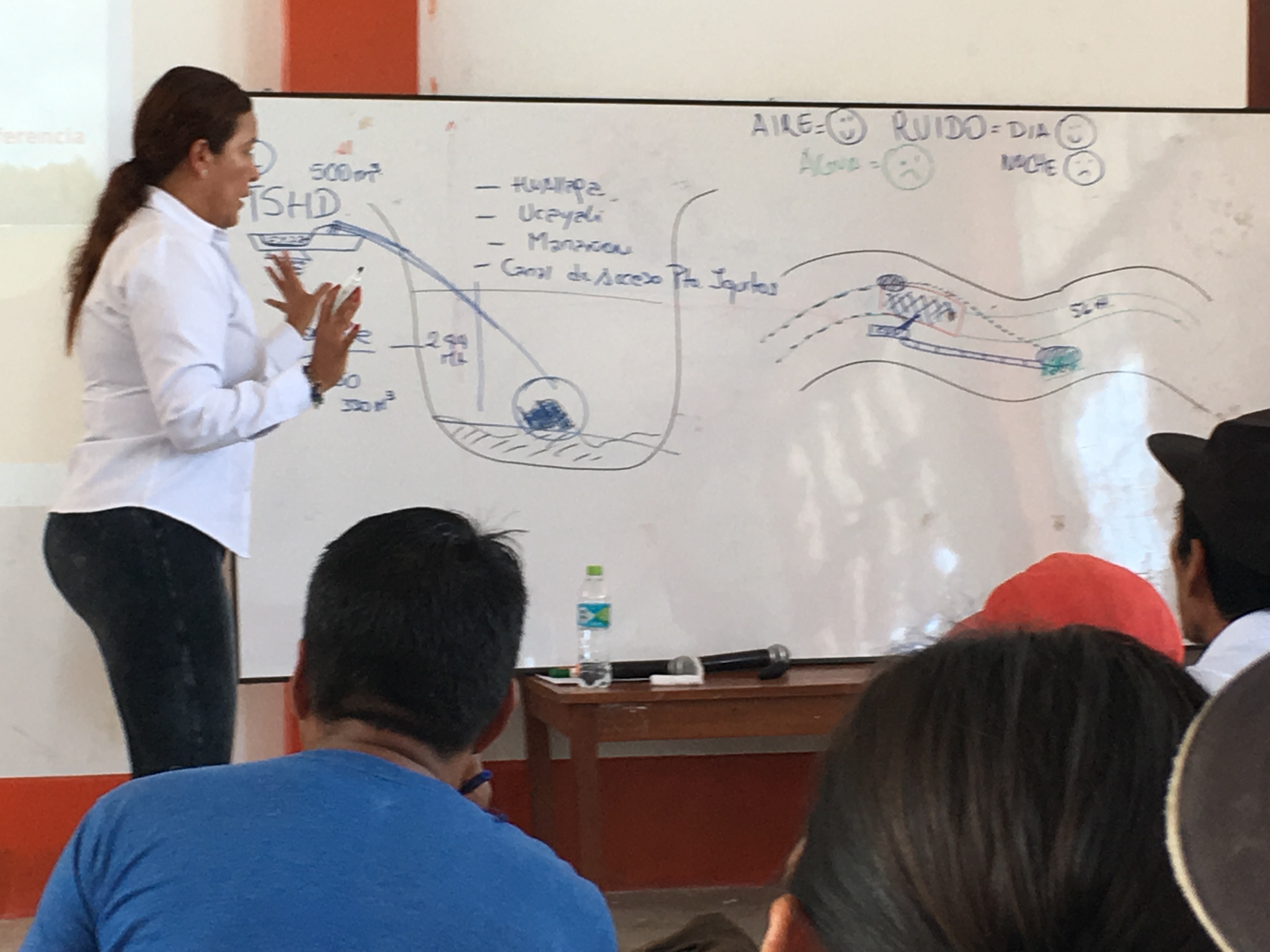 La parte central en ambas reuniones fue la presentación de los principales impactos ambientales (preliminares) encontrados. Se mencionó el posible desbarrancamiento por el incremento de la velocidad del río luego del dragado, la afectación de la calidad de agua afectando la zona de desove de peces y taricayas, las afectaciones a las áreas de pesca y la posible liberación de contaminantes de sedimento afectando a los usuarios del río.